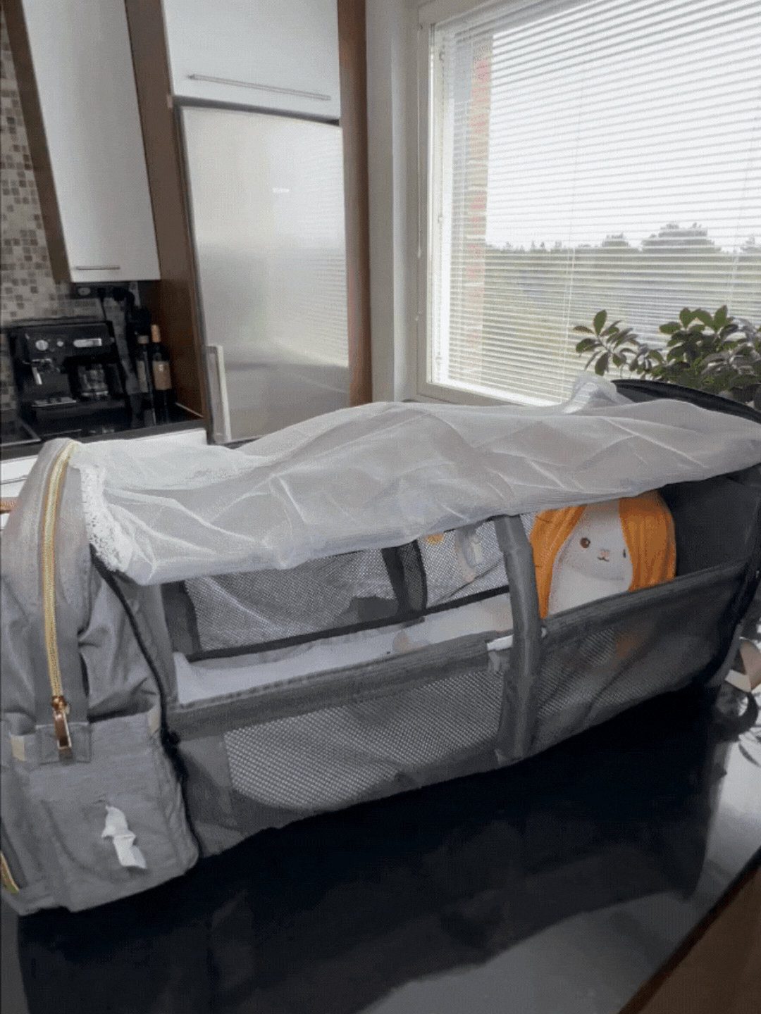 Arka fermuarı açıp destek çubuklarını sabitleyerek saniyeler içinde beşiğe dönüştürebilirsiniz. İşiniz bittiğinde ise kolayca katlayıp çanta formuna getirebilirsiniz.